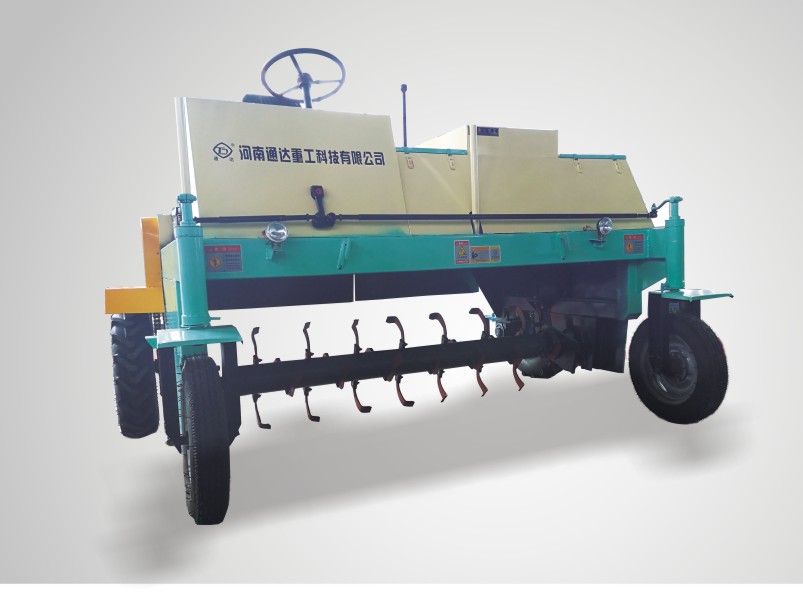 自走式翻堆機是以畜禽糞便、污泥、酒糟、糠醛渣等粘稠物料采用條垛式發(fā)酵工藝。即能對物料均勻攪拌、攏堆,又能對物料的板結(jié)塊進(jìn)行大三疏松。該機采取四輪行走設(shè)計,可前進(jìn)、倒退、轉(zhuǎn)彎,由一人操控駕駛。行駛中整車騎跨在預(yù)先堆置的長條形肥基上,由機架下掛裝的旋轉(zhuǎn)刀軸對肥基原料實施翻拌、蓬松、移堆,車過之后篡成新的條形垛堆。即可在開闊場地,也可在車間大棚中實施作業(yè)。該機一大技術(shù)突破在于整合了物料發(fā)酵后期的破碎功能。隨著物料逐漸脫水,加裝破碎裝置的刀軸可有效地破碎肥料在發(fā)酵過程中形成的板塊,不僅省去了一臺粉碎機,更主要的大大提高了粉碎的效率,降低了成本,從根本上解決了生產(chǎn)量受粉碎機制約的問題。該設(shè)備動力為水冷型柴油機,其投資少、能耗低,使用靈活方便,節(jié)省了土建工程和大量的人力物力。